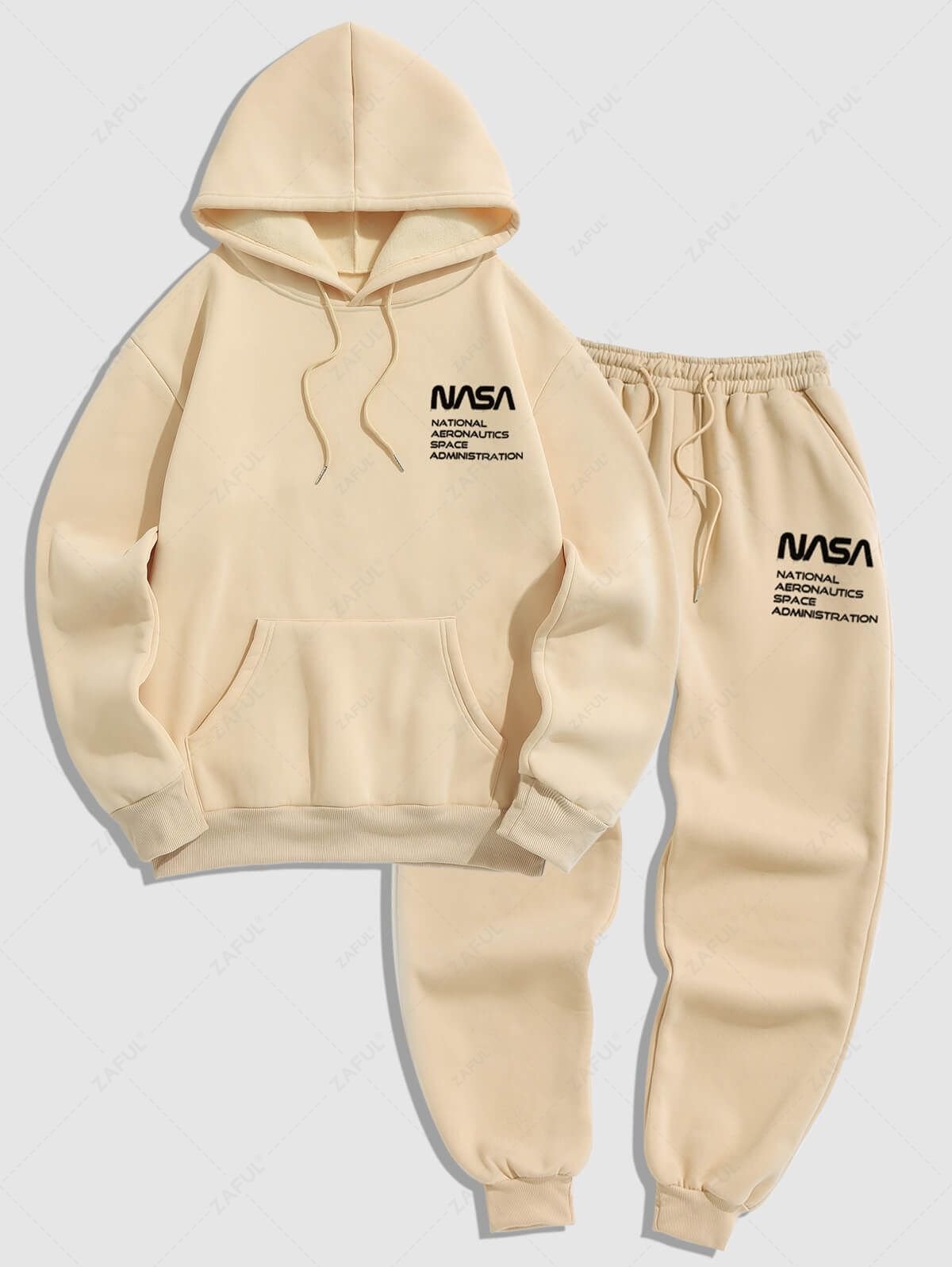 Men’s Casual Letter Pattern Fuzzy Fleece-lined Kangaroo Pocket Design Pullover Hoodie And Drawstring Jogger Sweatpants Set – Light Coffee M