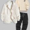 Men’s Solid Color Label Design Fuzzy Fleece Kangaroo Pocket Hoodie And Drawstring Jogger Pants Set – Crystal Cream Xxl